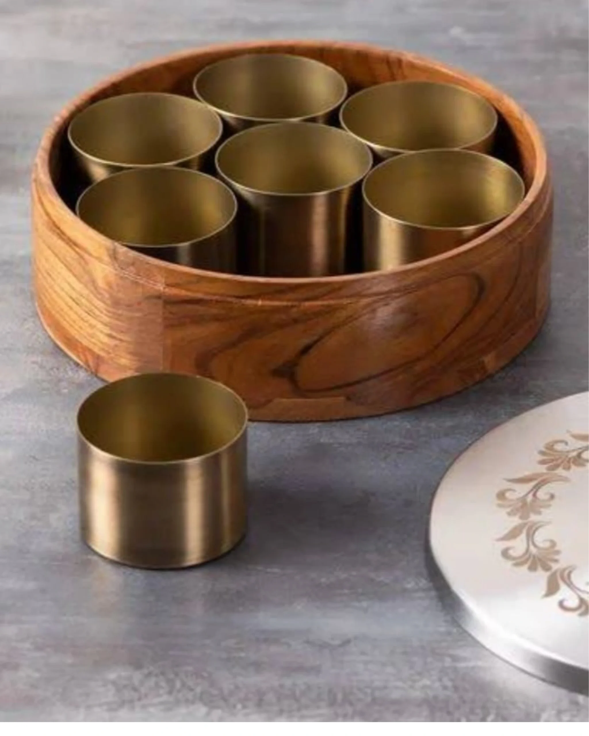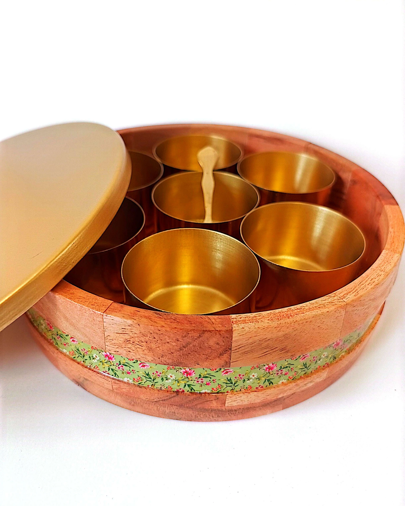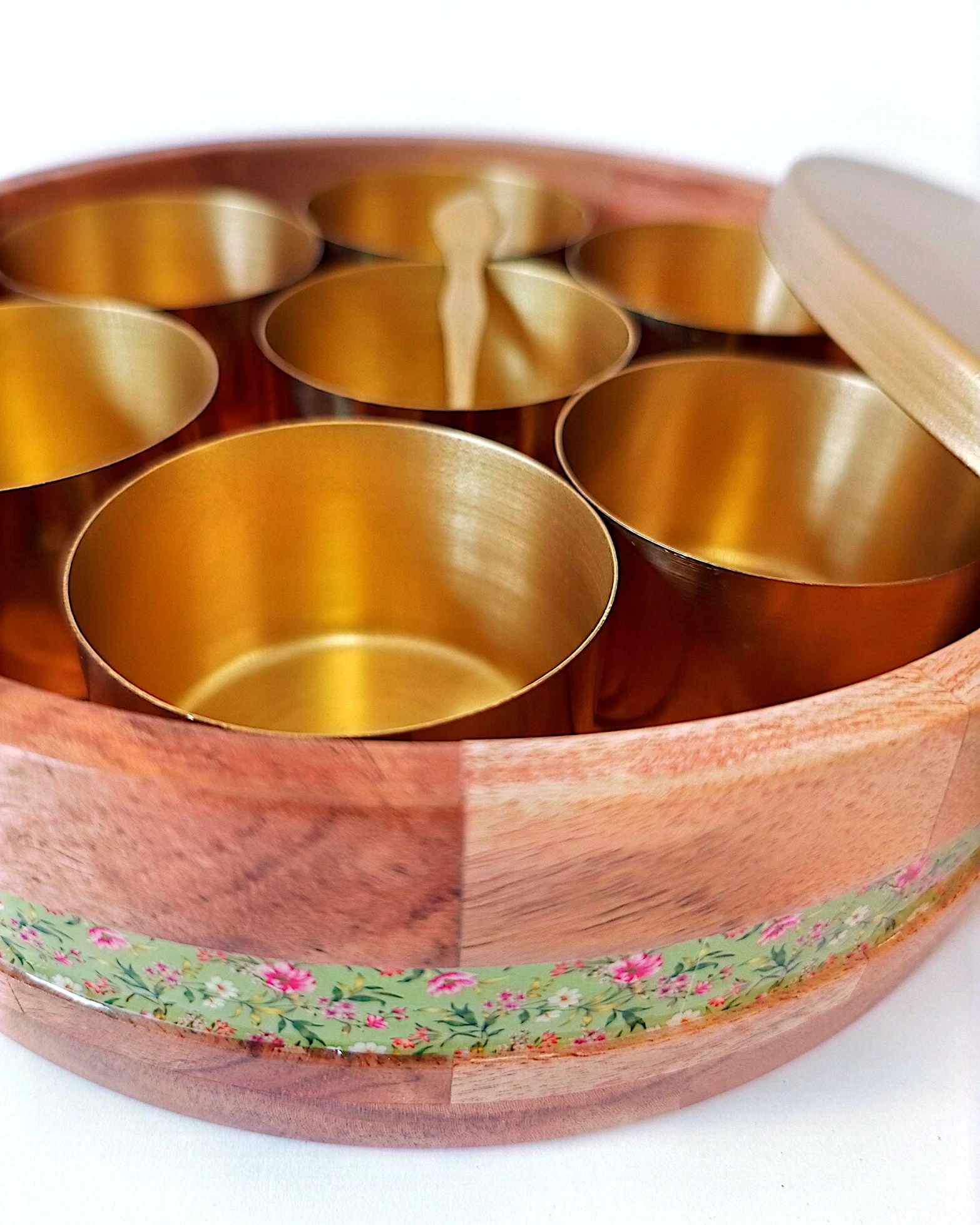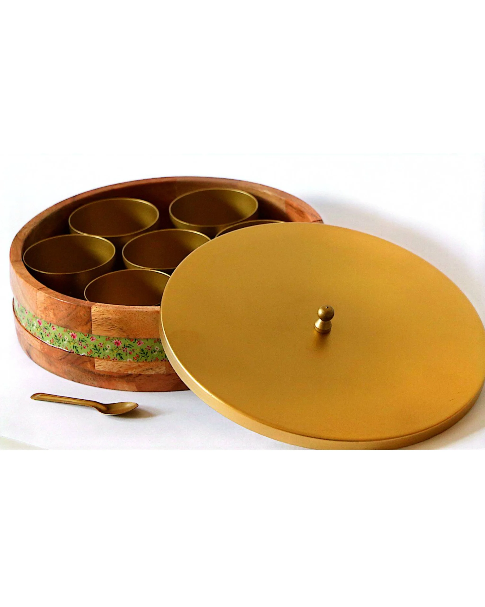 Authentic Spice Masala Box with Wooden Base & Matt Finish Metal Lid with seven containers – For every Kitchen
