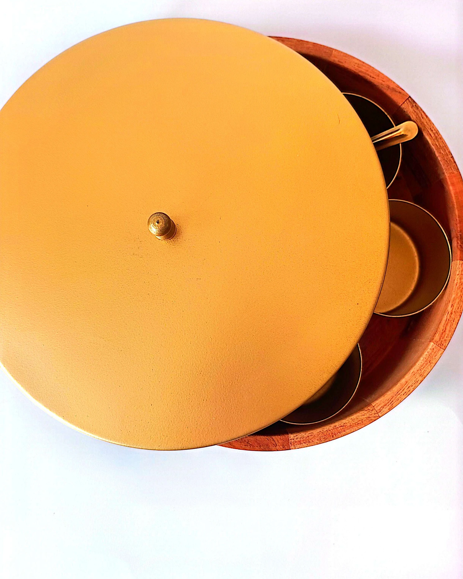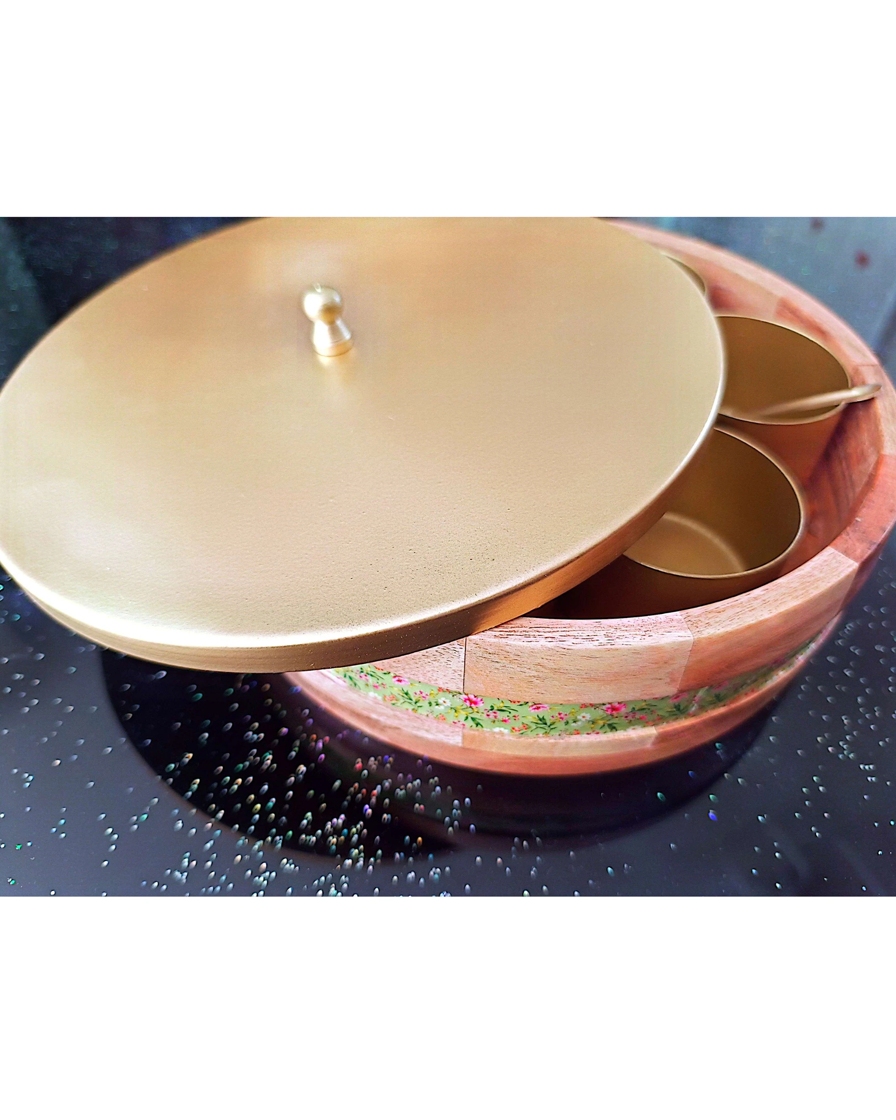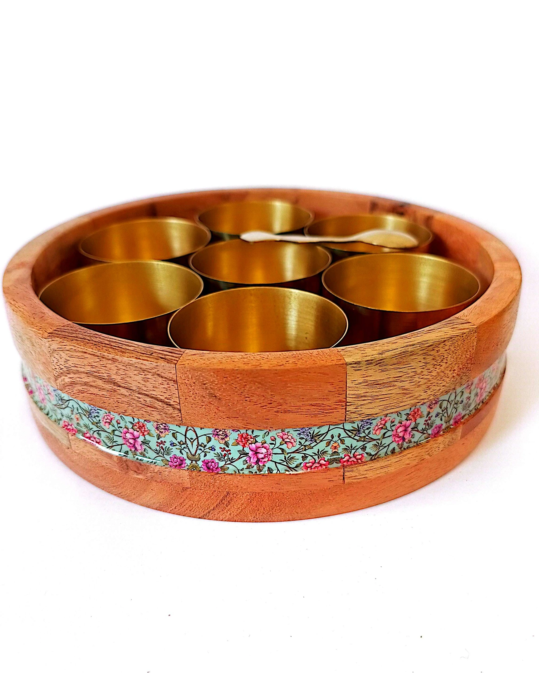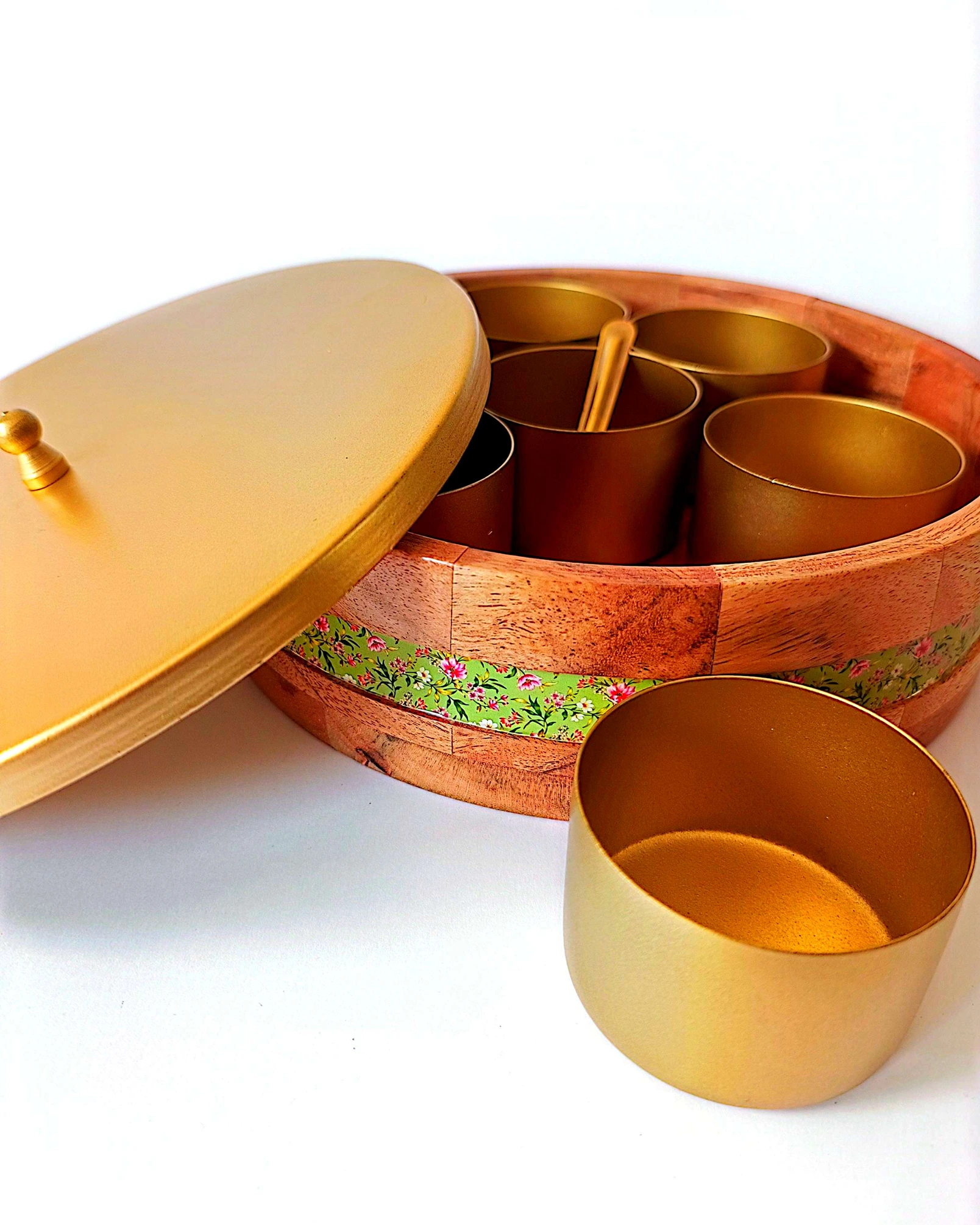 Authentic Spice Masala Box with Wooden Base & Matt Finish Metal Lid with seven containers – For every Kitchen